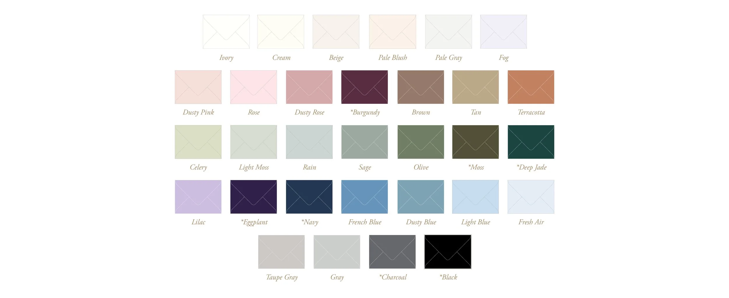 *For address legibility purposes, these envelope colors require white ink digital printing or hand calligraphy